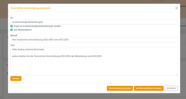 Ab sofort können Sie für Ihre Nutztierkunden automatisch einen Bestandsbucheintrag erzeugen, der alle relevanten Informationen zu abgegebenen Medikamenten enthält. Damit erleichtern Sie Betrieben die gesetzlich vorgeschriebene Dokumentation und reduzieren gleichzeitig deren manuellen Aufwand. Der Bestandsbucheintrag umfasst die abgegebenen Medikamente mit Mengenangaben sowie die VVVO-Nummer und wird den Betrieben zur Ergänzung und Ablage bereitgestellt.