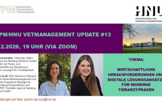 Kostenloses Online-Event für Tierärzt:innen und TFAs: Beim TPM/HNU Vetmanagement Update #13 am 9. Februar 2026 stehen wirtschaftliche Herausforderungen und digitale Lösungen für Tierarztpraxen im Fokus. In Kooperation mit der Hochschule Neu-Ulm und dem Bundesverband TPM. Teilnahme via Zoom.