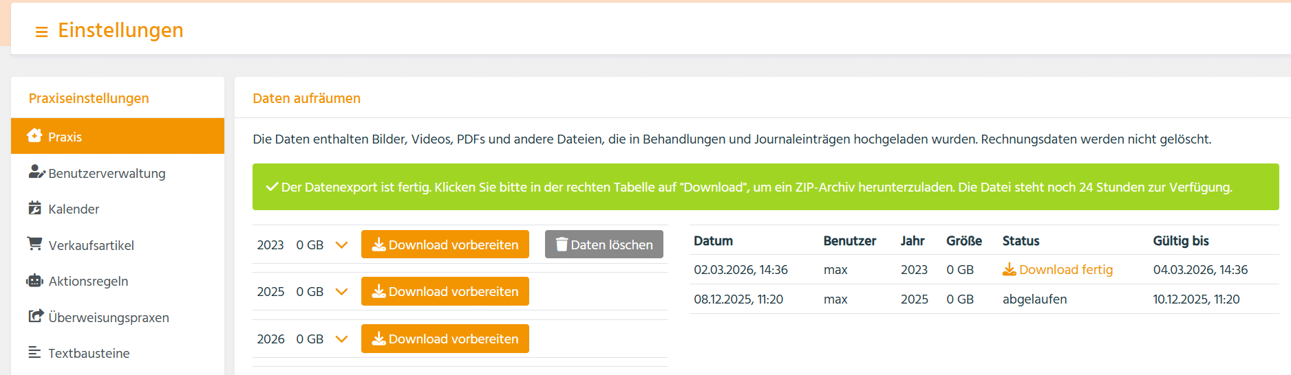 Nicht mehr benötigte Rechnungs-PDFs können ab sofort aus dem System entfernt werden – und zwar kalenderjahrweise vom Systembeginn bis einschließlich zum vorletzten Jahr (aktuell bis 2024).
