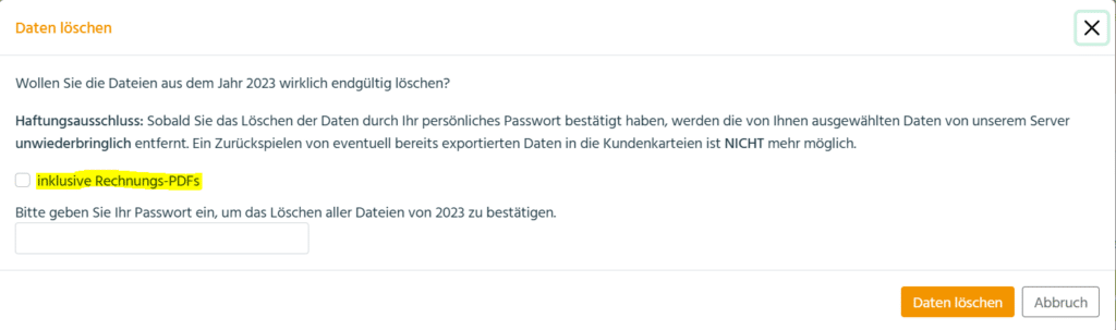 Nach dem Klick darauf werden Sie zur Sicherheit aufgefordert, Ihr Passwort erneut einzugeben. Zusätzlich erscheint die Checkbox „inklusive Rechnungs PDFs“, die für das endgültige Löschen der PDF Dateien aus dem inBehandlung System aktiviert werden muss: