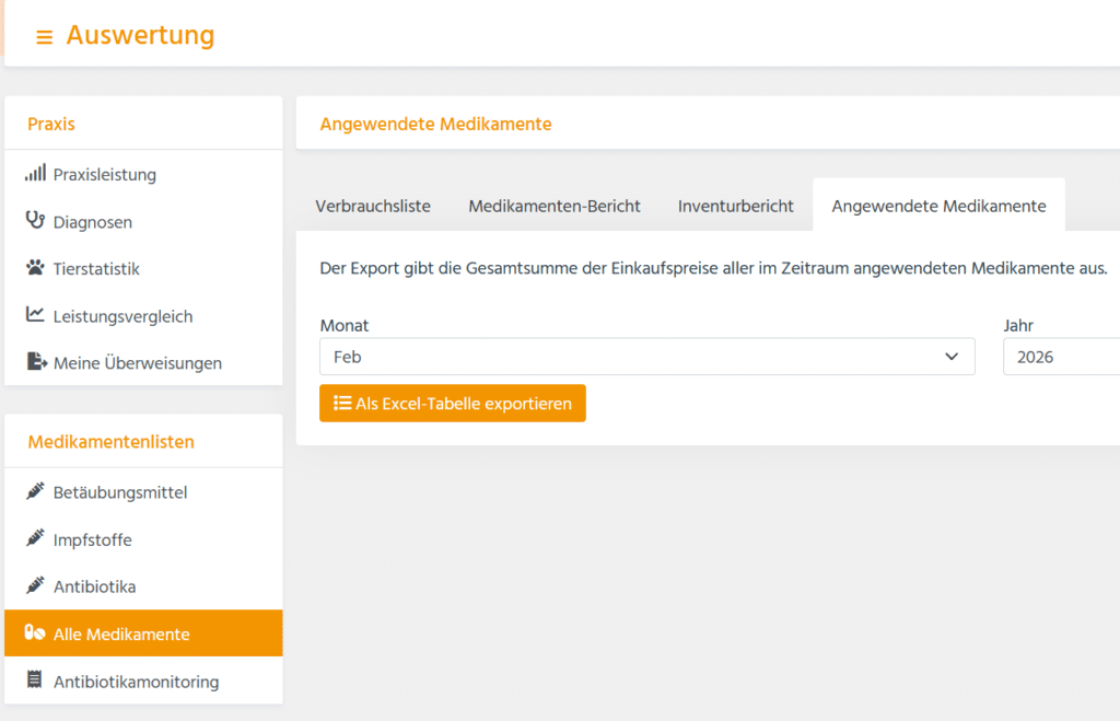 Unter Auswertung → Alle Medikamente steht nun der neue Unterreiter „Angewendete Medikamente“ zur Verfügung.