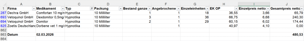Es wird die Gesamtsumme der Einkaufspreise aller im gewählten Zeitraum angewendeten Medikamente berechnet – einzeln je Medikament und Einzeleinheit aufgelistet und zusätzlich summiert.