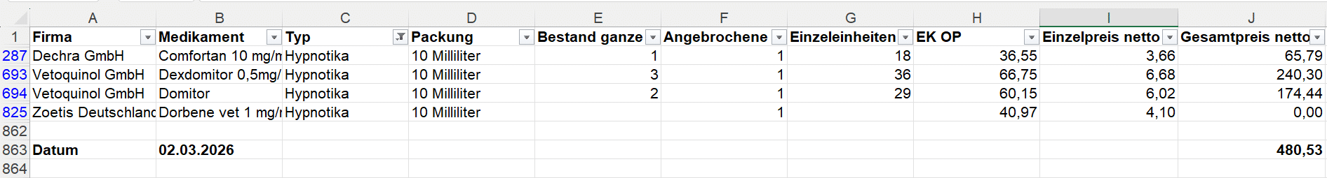Dort wird der zum Zeitpunkt des Exports aufsummierte Warenwert der gelisteten Medikamente angezeigt.